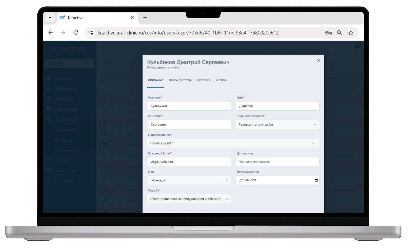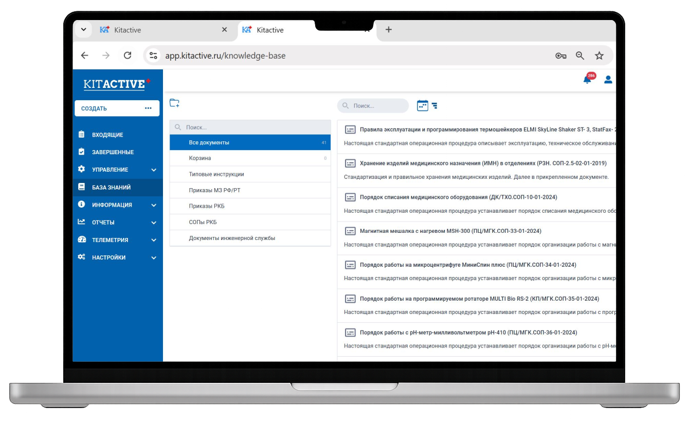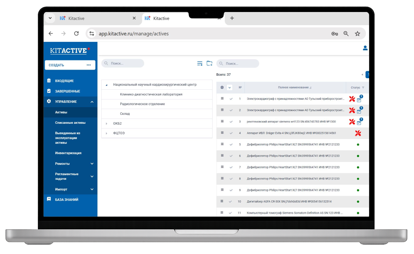 KITACTIVE — программное обеспечение для автоматизации процессов учета и обслуживания медтехники, дистанционного контроля технического состояния, через формирование ранних сигналов о неисправностях, прогнозной и превентивной аналитики о состоянии оборудования.